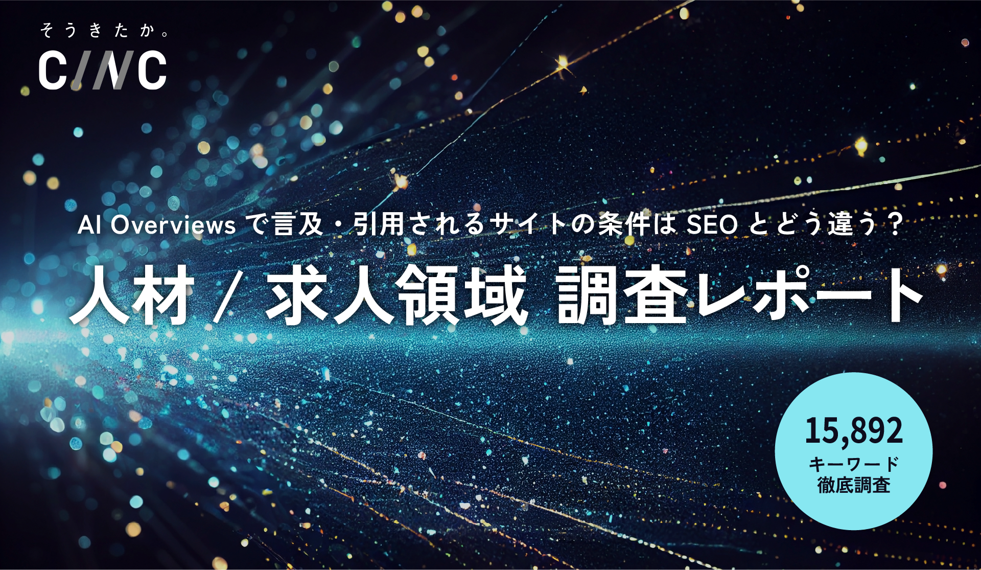 株式会社CINC(本社:東京都港区、代表取締役社長:石松友典、以下CINC)は、人材/求人領域におけるGoogle検索「AI Overviews(以下、AIOs)」に関する調査を実施いたしました。本調査では、当該領域の主要キーワード15,892件を分析し、5つの仮説に基づいて検証を行っています。AIOsの回答内で言及されやすいブランド(企業名や商品・サービス名)や、引用されやすいWebサイトの傾向を明らかにするとともに、推奨アクションについても提示しています。