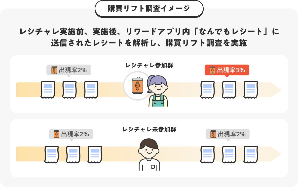 今回の施策においては業界初・“全流通横断型の購買データ”の取得と分析が可能な「AIレシート」(※)を活用し、期間中に投稿されたレシートデータを集積し、ユーザーの購入品や購買頻度等を分析しています。