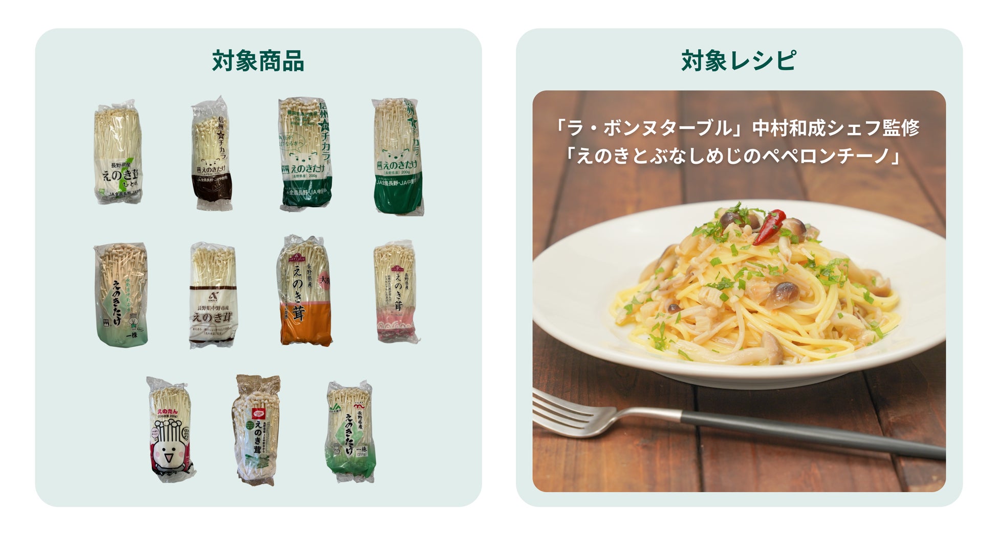 体験レシピとして、「ラ・ボンヌターブル」中村和成シェフが監修した「えのきとぶなしめじのペペロンチーノ」を設定し、鍋以外の多様な調理方法を提案することで、夏場に落ち込みやすい需要の底上げを促進。期間は2025年7月1日から9月10日までの「レシチャレ」期間と、7月1日から9月12日までの「たべチャレ」期間で実施しました。