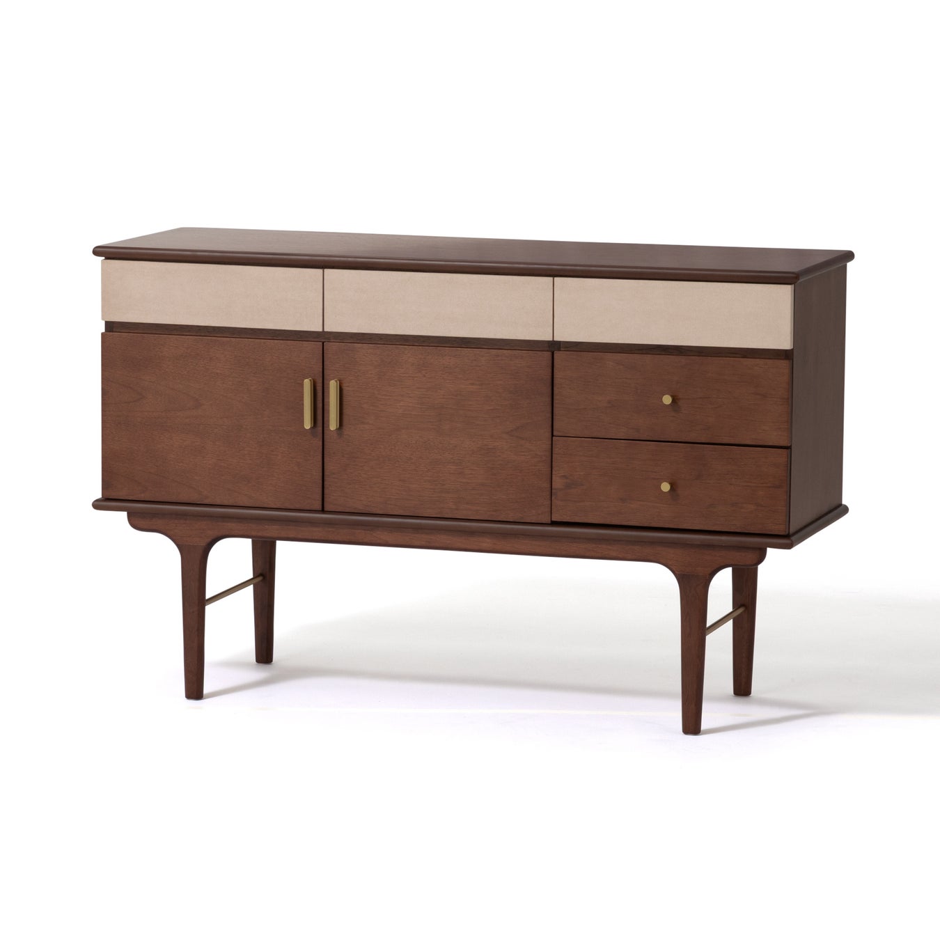 天然木の深みあるダークブラウンにゴールドのアクセントを効かせた、ベーシックなデザインのサイドボードです。上段はA4サイズのファイルも収納でき、さまざまな用途に対応します。同シリーズのコスメデスクやナイトテーブルと組み合わせれば、統一感のある上質なインテリアコーディネートが完成します。