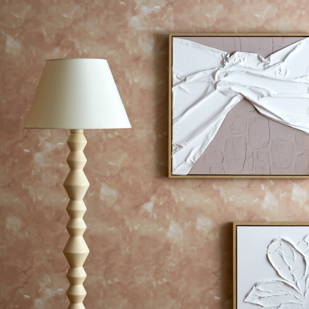 ウッドスタンドのデザインがユニークなフロアランプです。ポール部分にデザインを⼊れることで消灯時もオブジェのように使用でき、お部屋を洗練された印象に彩ります。