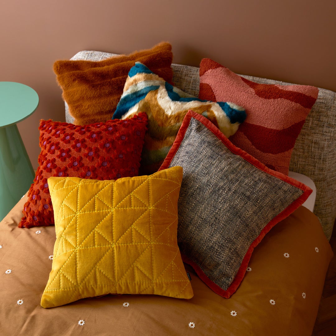 幾何学柄をキルティングで表現したクッションカバーです。ポップなデザインがお部屋を明るく彩ります。