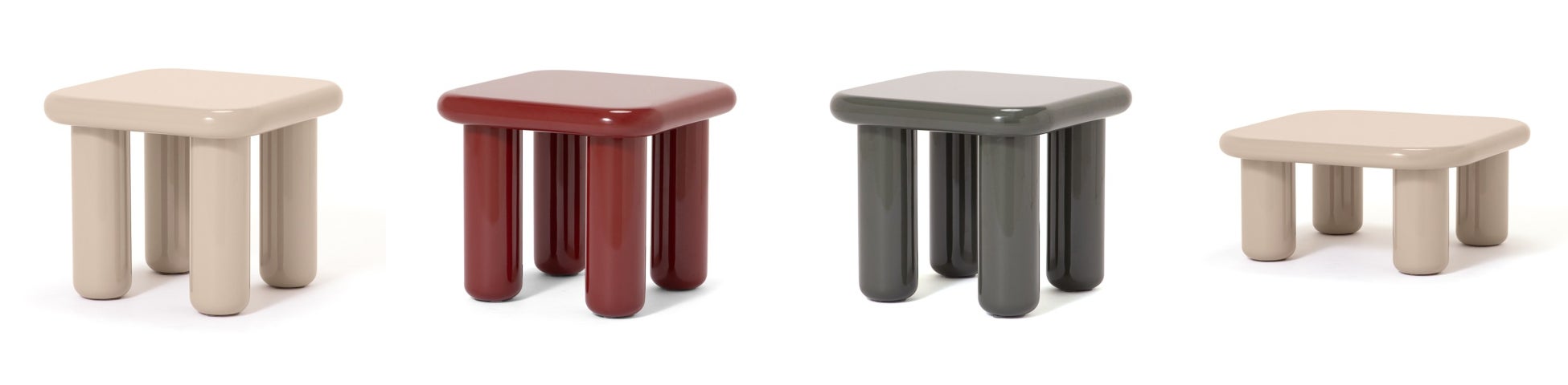 ぽってりとした丸みと厚みが特徴のコーヒーテーブルとサイドテーブルです。昨今のインテリアトレンドとなっているハイグロス塗装の天板と太めの円柱脚がお部屋をあか抜けた印象に仕上げます。コーヒーテーブルは3色展開で、お部屋に取り⼊れやすく鏡⾯の美しさが際⽴つベージュをはじめ、インテリアのアクセントになるレッド、インテリアに深みとこなれ感をもたせられるグリーンを展開。サイズの異なるコーヒーテーブルを組み合わせて、色違いでコーディネートすることもおすすめです。サイドテーブルはコの字型でソファに差込んで使用できます。