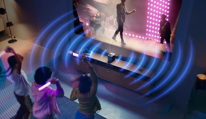 「LG CineBeam S」は、壁との距離わずか約8cmで40インチ、約40cmで100インチの大画面を投影可能。大画面を投影するために、家具の配置を変えて距離を確保する必要もありません。また、壁そば設置が可能なため、投影場所とプロジェクターの間を横切っても映像視聴の邪魔になることなく、動画を投影しながら運動したり、立ったままスポーツ観戦したり、自由なコンテンツ視聴を実現。リビングルームはもちろん、書斎や寝室など、どんな空間でも壁の前に置くだけで没入感ある映像体験を提供します。