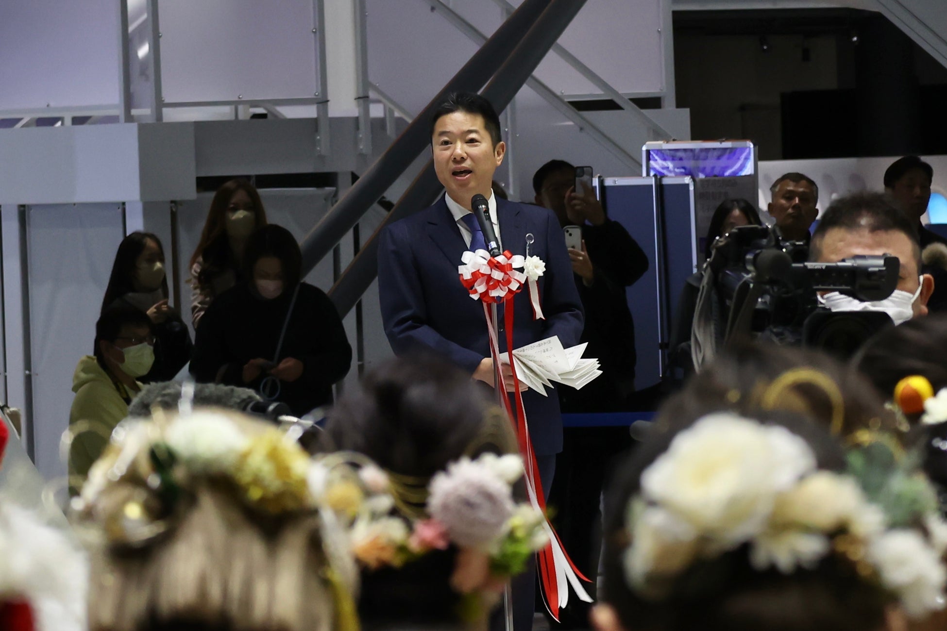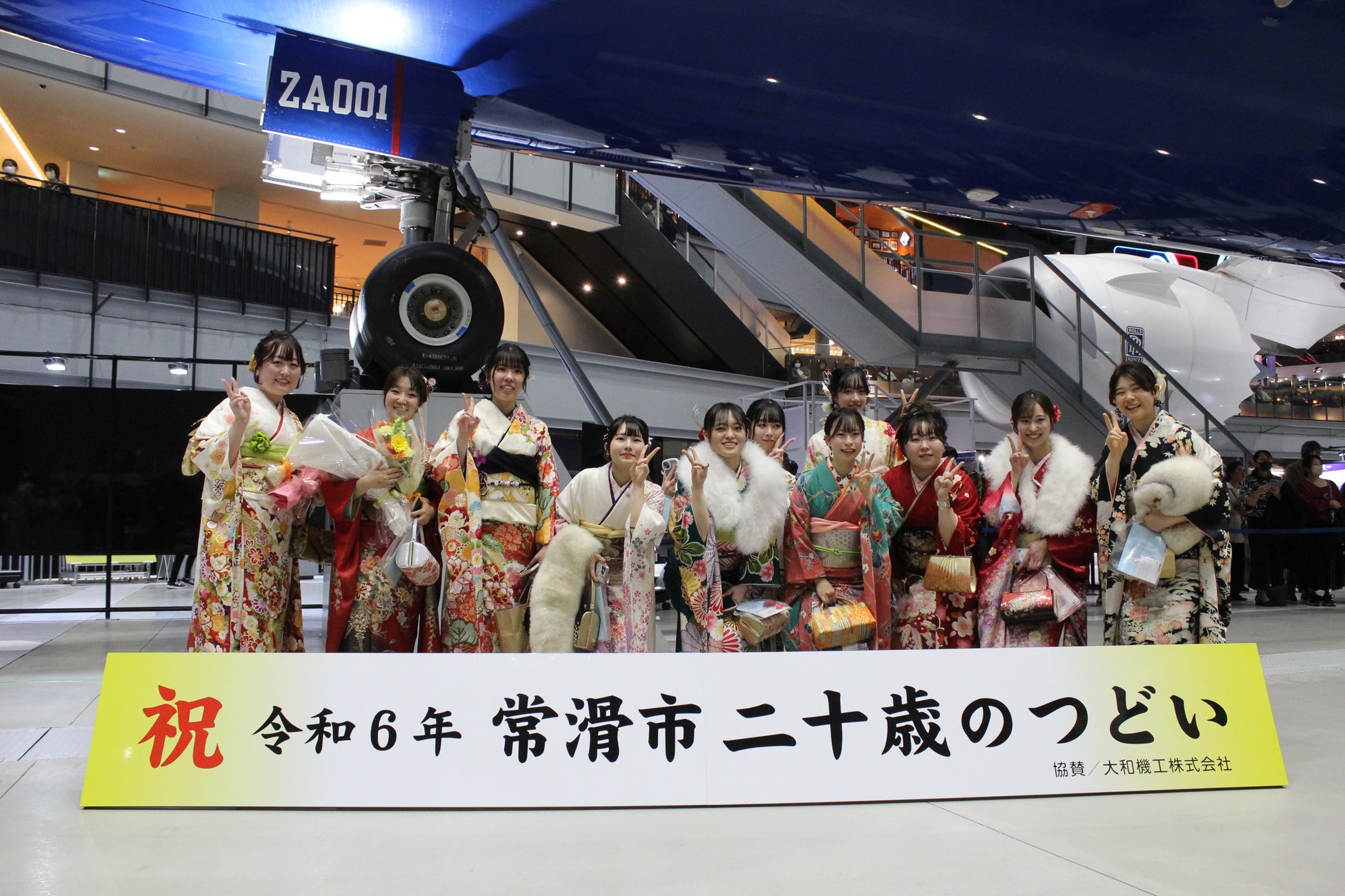 中部国際空港セントレアでの開催は今回が初めてのことで、常滑市で二十歳を迎える586人のうち、481人が参加し、ボーイング787初号機の目の前という特別な会場で祝福され、人生の新たな一歩を踏み出しました。