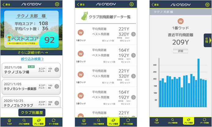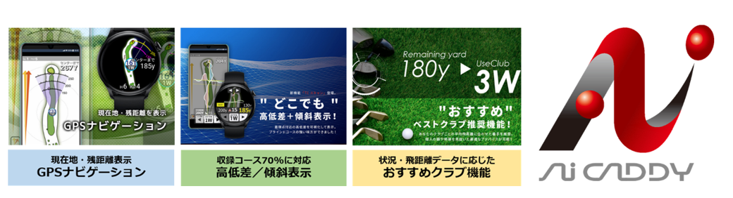 株式会社テクノクラフトの提供するアプリ「AiCADDY(エーアイキャディ)」は、ゴルフ場コース図表示、GPS機能を使った残距離表示に加えて高低差情報を加味した飛距離予測や、状況に応じたおすすめクラブ機能を搭載。ラウンド時のアプリ使用回数を重ねるたびに、飛距離や傾向をAiCADDYが学習し、気温・気圧による影響度を考慮した予測を算出します。コース数は、日本全国2,300以上を収録。初心者から上達思考のゴルファーまで、幅広くご利用可能なゴルフアプリケーションです。アプリご利用料金は、2ラウンドまで無料トライアル、以降月額240円または年額2,400円のいずれかを選択可能です。