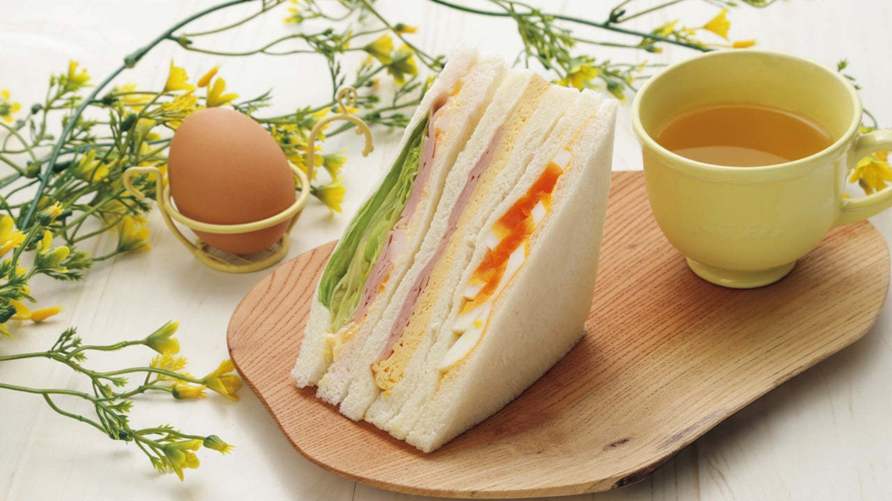 サンドイッチの人気フレーバー「たまご」を存分に楽しめるよう、3種類のたまごサンドをセットにしました。「たまごサラダ」はハムレタスと一緒に。「玉子焼」はほんのり甘い味つけです。「ゆで卵」はスライスしてたまごサラダと合わせてはさみました。とにかくたまごサンドが大好き!という方に向けた、玉子づくしのサンドです。