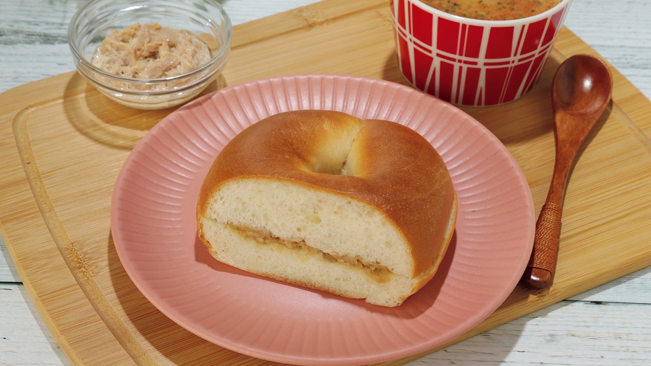 もちっ、むぎゅっとしたベーグル生地にツナマヨネーズをサンドしました。サラダを合わせたり、スープと一緒に召し上がるなど、シンプルな具材のみなので、いろんな組み合わせで楽しめるベーグルサンドです。
