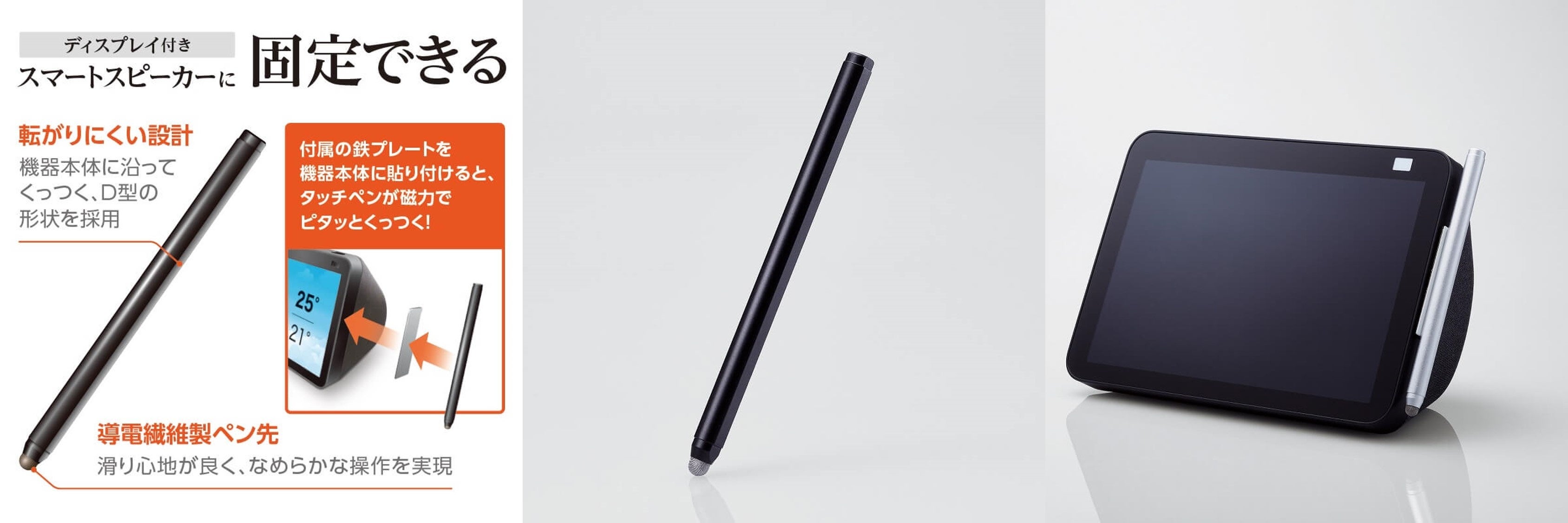 手帳用タッチペン“P-TPSPLFシリーズ”は、手帳型ケースの内側に挟める、極薄ボディのタッチペンです。薄さ1.8mmで内側に挟んでもかさばらず、軽量なのでケースに付けても重さが気になりません。マグネット式タッチペン“P-TPSMGシリーズ”は、スマートスピーカー本体やタブレッドなどに固定できるタッチペンです。付属の両面テープ付き鉄プレートを使って、さまざまな場所に固定することができます。
