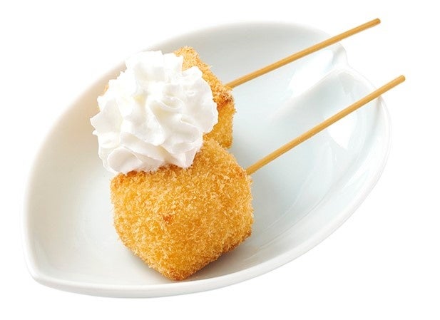 一口サイズのチーズケーキを串カツにしてホイプクリームを乗せました。とろシュワ食感がクセになる!