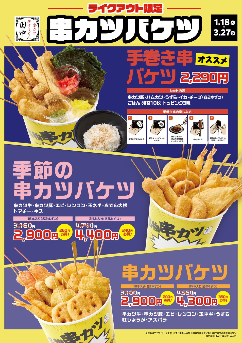 通常の「串カツバケツ」に加え、「手巻き串バケツ」と「季節の串カツバケツ」が登場!