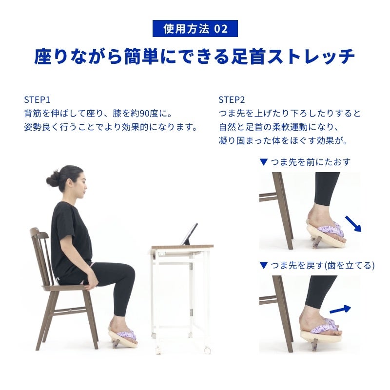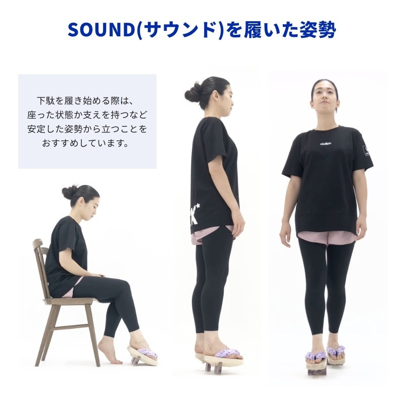 SOUNDは履くだけで自然と姿勢が安定する下駄です。SOUNDを履いて「足踏み」、「歩行」、「椅子に座る」、「スクワット」などの日常生活の動作に取り入れることで、自然と声が出しやすい姿勢を獲得することができます。
