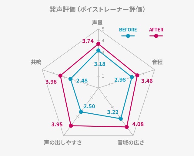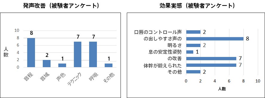 ボイストレーナーによる評価では、発声の評価項目すべてで改善がみられ、「共鳴」においては全員、音域の広さ、声の出しやすさにおいては10人中9人の改善が確認できた。