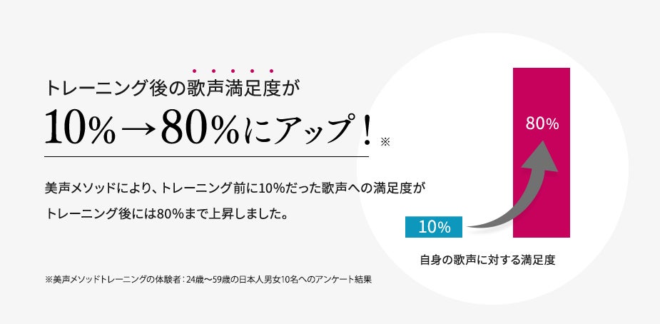 ②事前事後に行った被験者アンケートでは、トレーニング前10%だった歌声への満足度がトレーニング後には80%に上昇した。(10人中7人が自身の歌声に対する満足度が上がった)