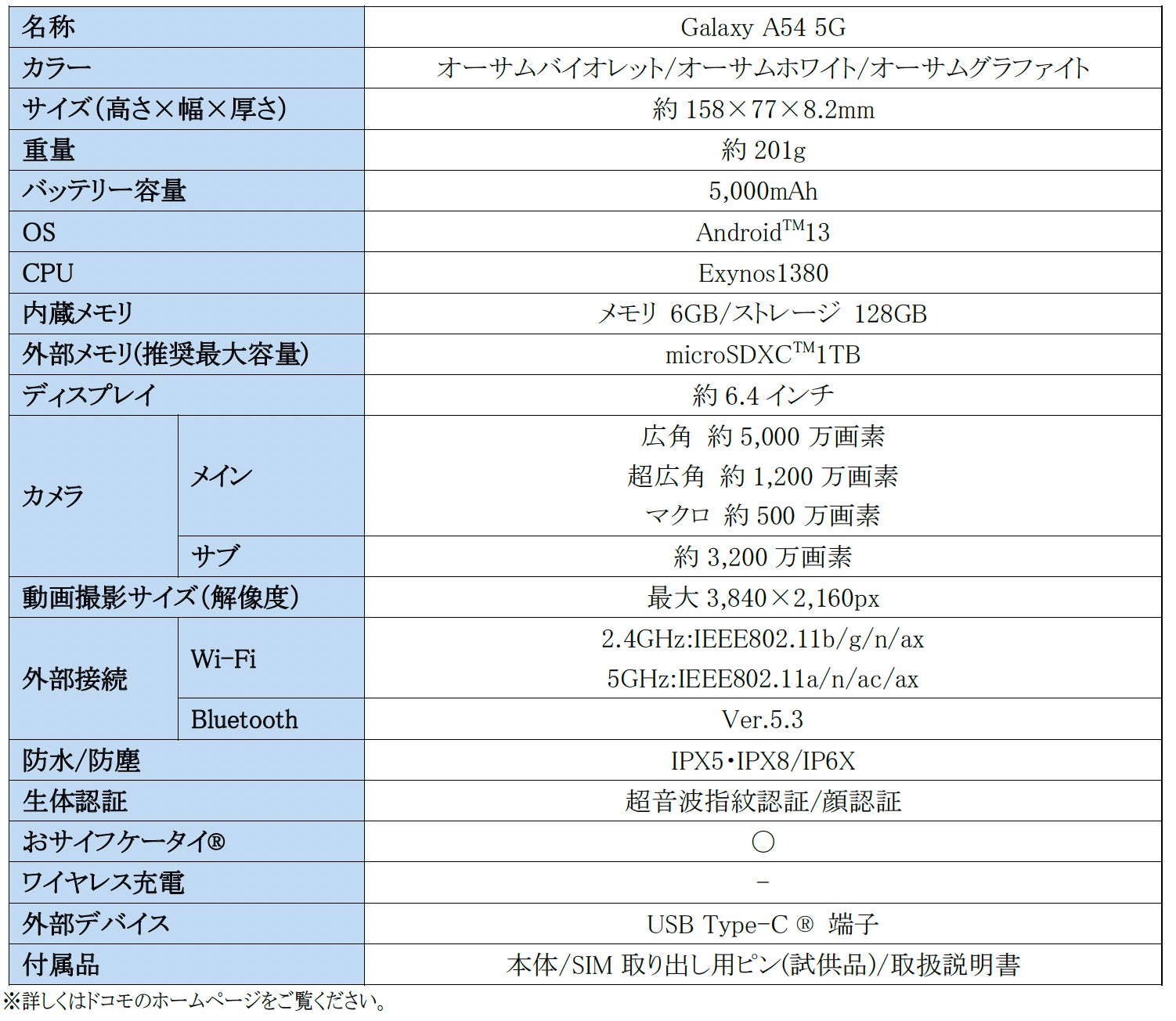 〈ドコモ〉大容量バッテリー、光を多く取り込めるカメラセンサー、より明るいディスプレイ搭載、よくばりな理想を充実機能で叶えるAwesomeなスマートフォン「Galaxy A54 5G」発売日決定