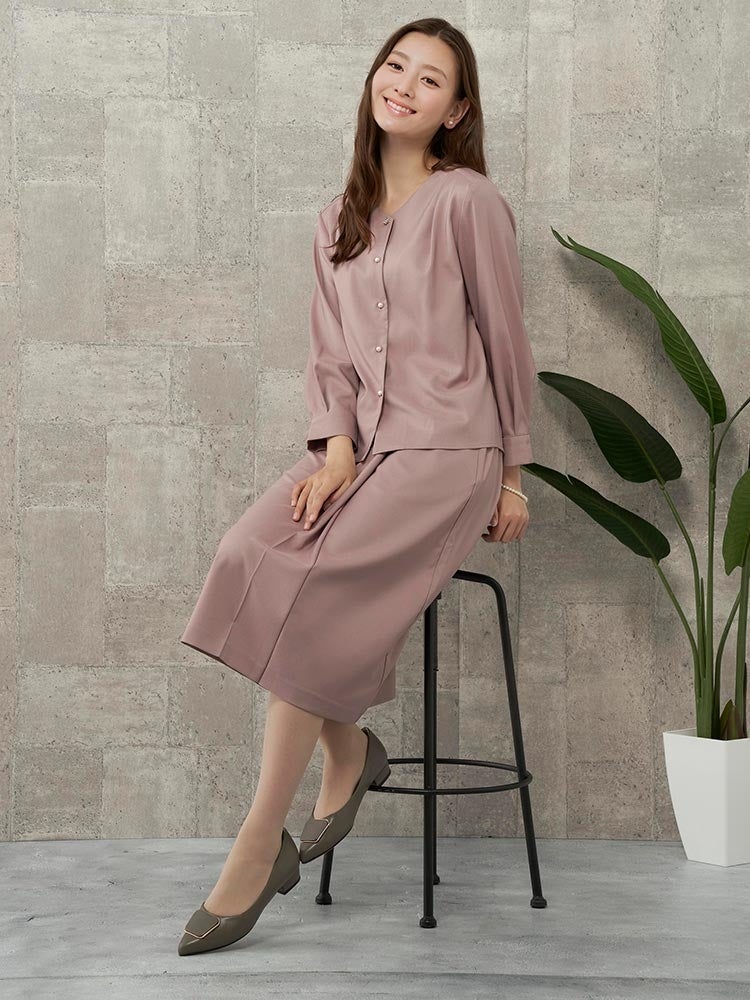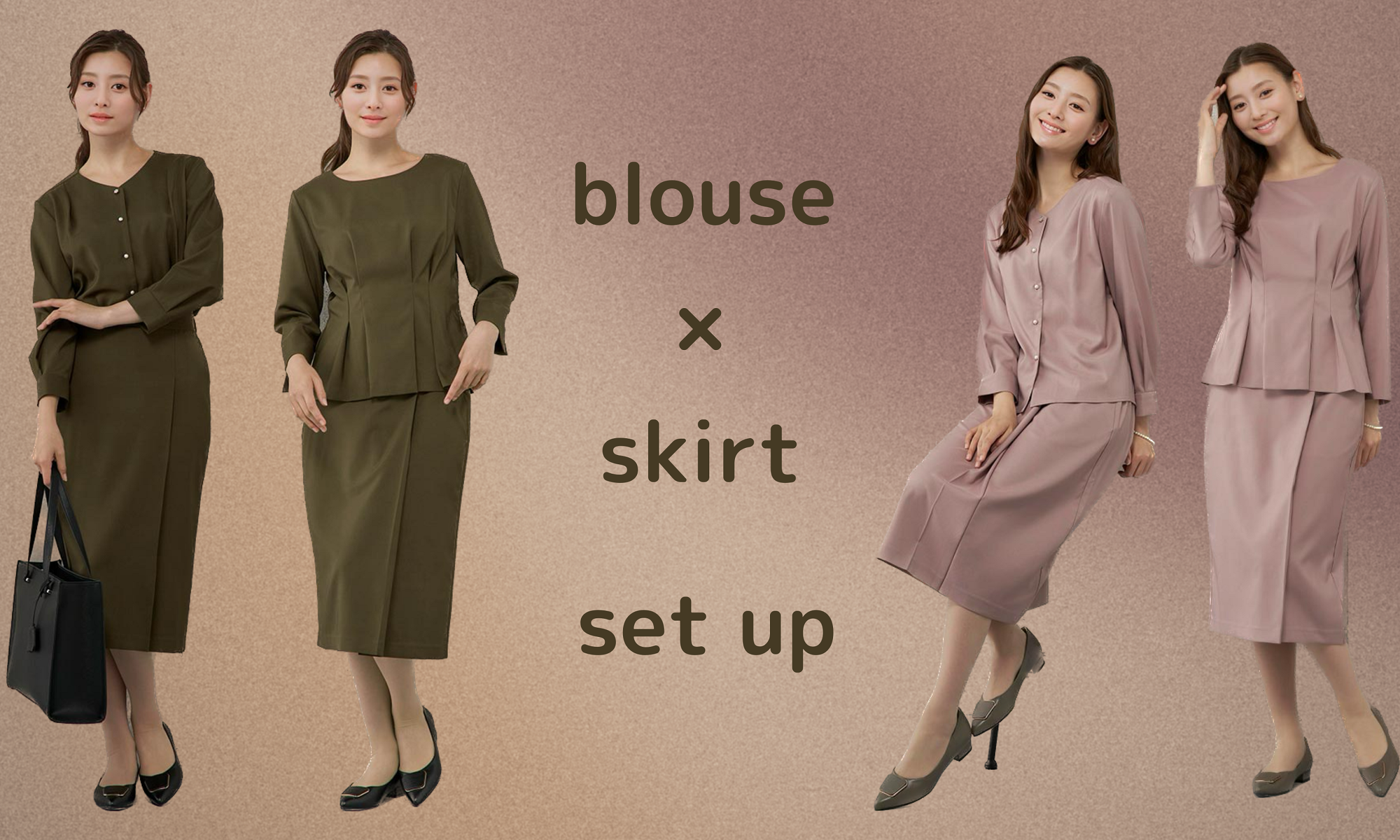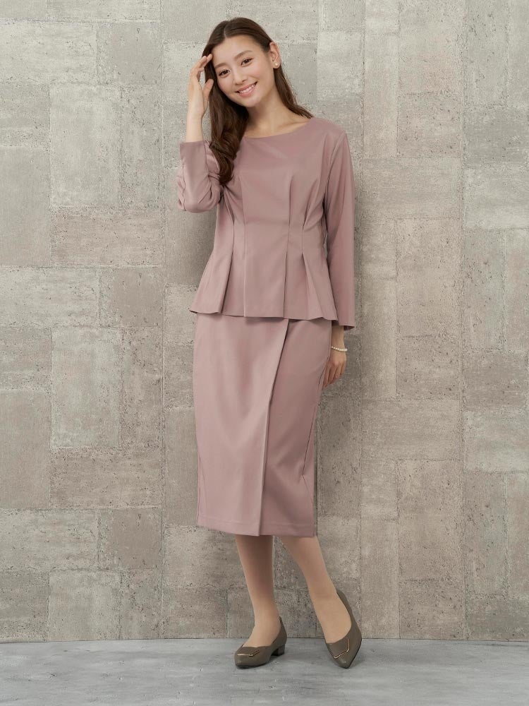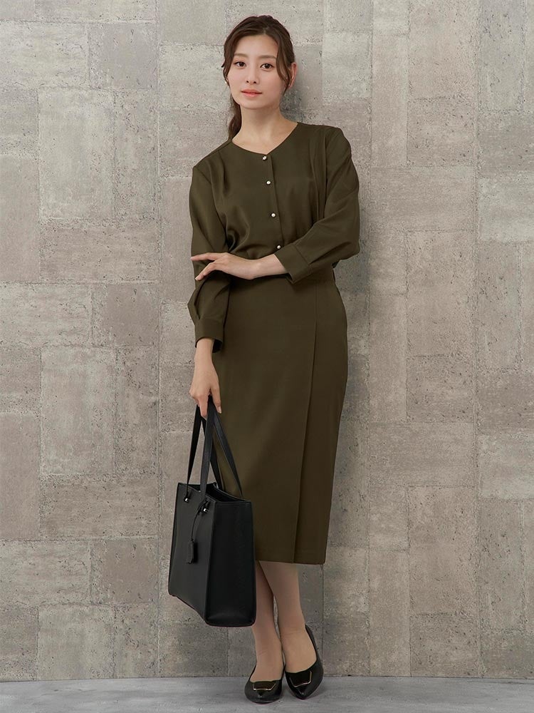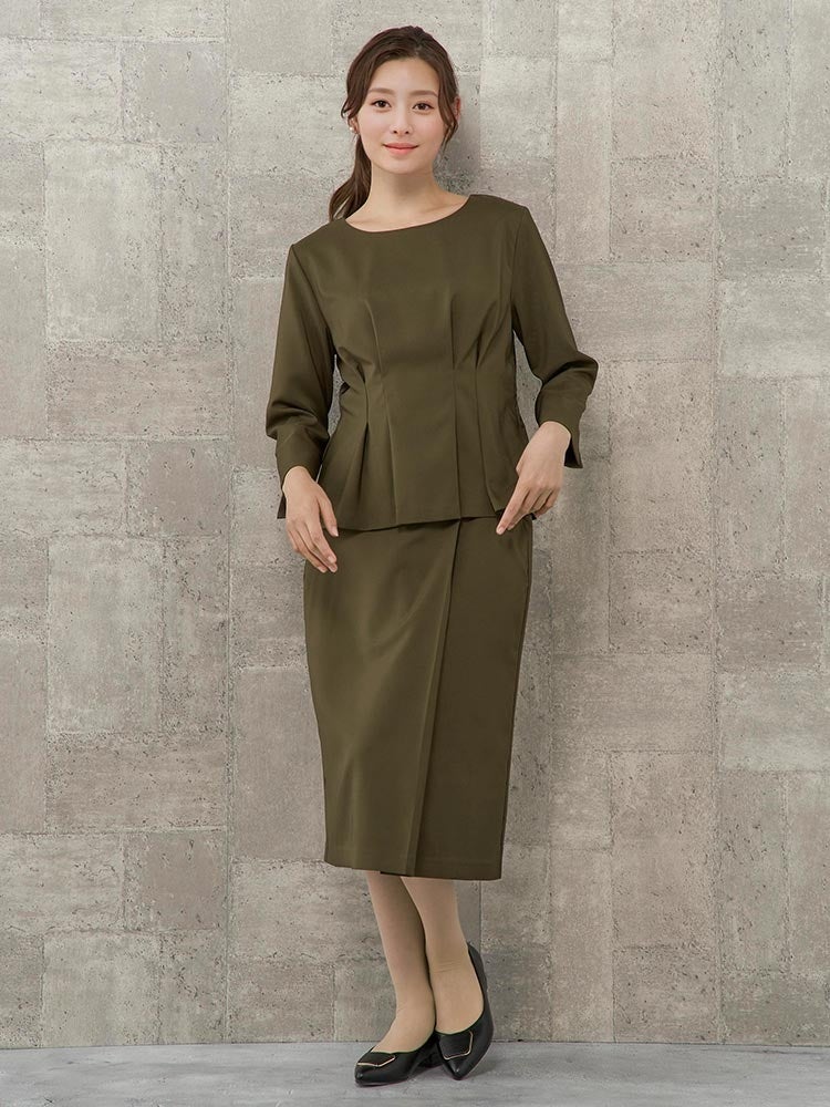 P.S.FAの人気シリーズ“お仕事OK”ウェアから、着るだけできちんと感を演出し上品なスタイリングに仕上げてくれるブラウスとスカートのセットアップが新発売。季節感が楽しめる深めのカーキと大人っぽい印象のくすみピンクの2色展開です。ビジューボタンが華やかな前開きブラウス、フェミニンでスタイルアップが叶うペプラムブラウスと、同生地のラップ風ミディアム丈スカートでご用意しました。オフィスを始めオケージョンでも活躍するマルチウェアとなっております。