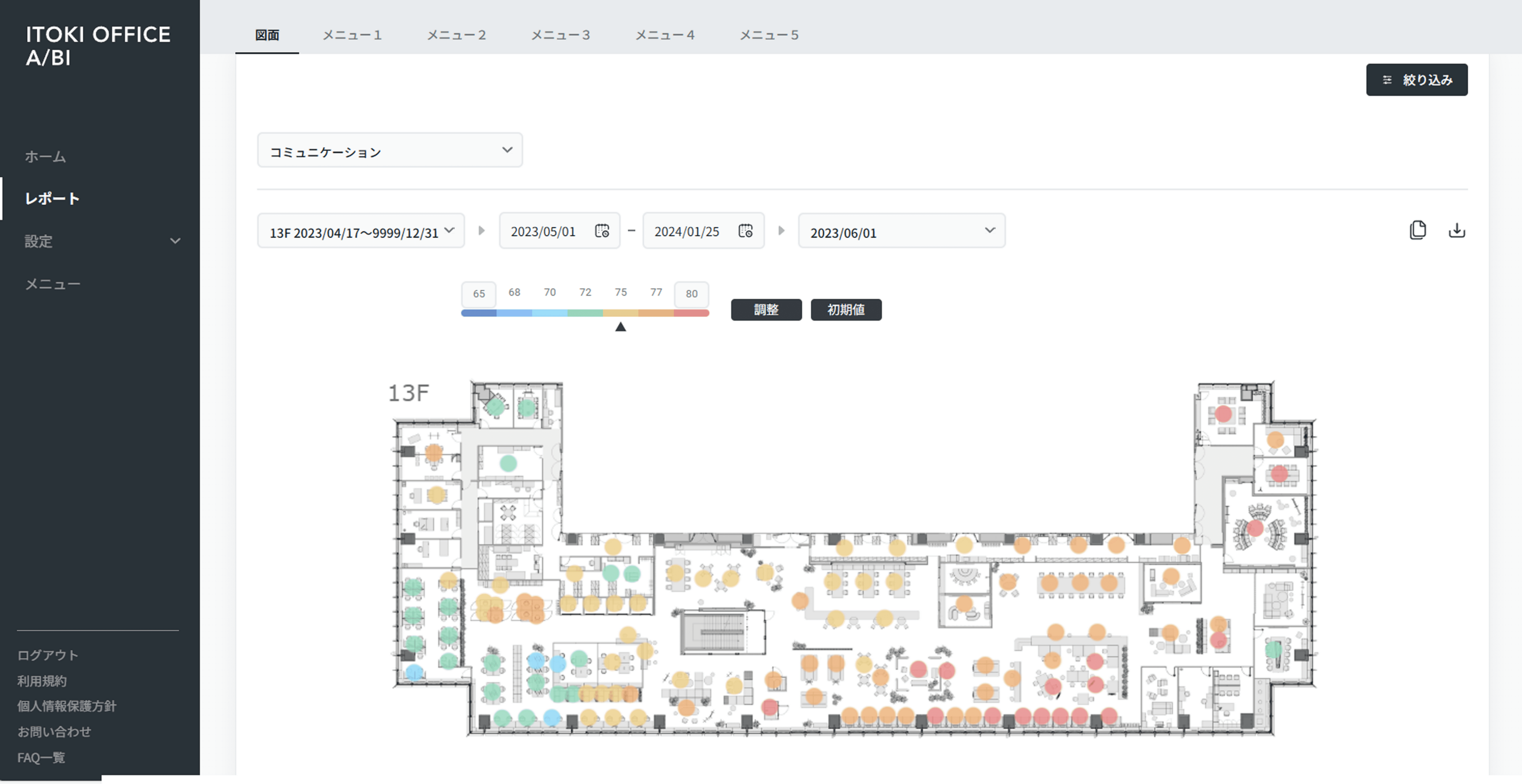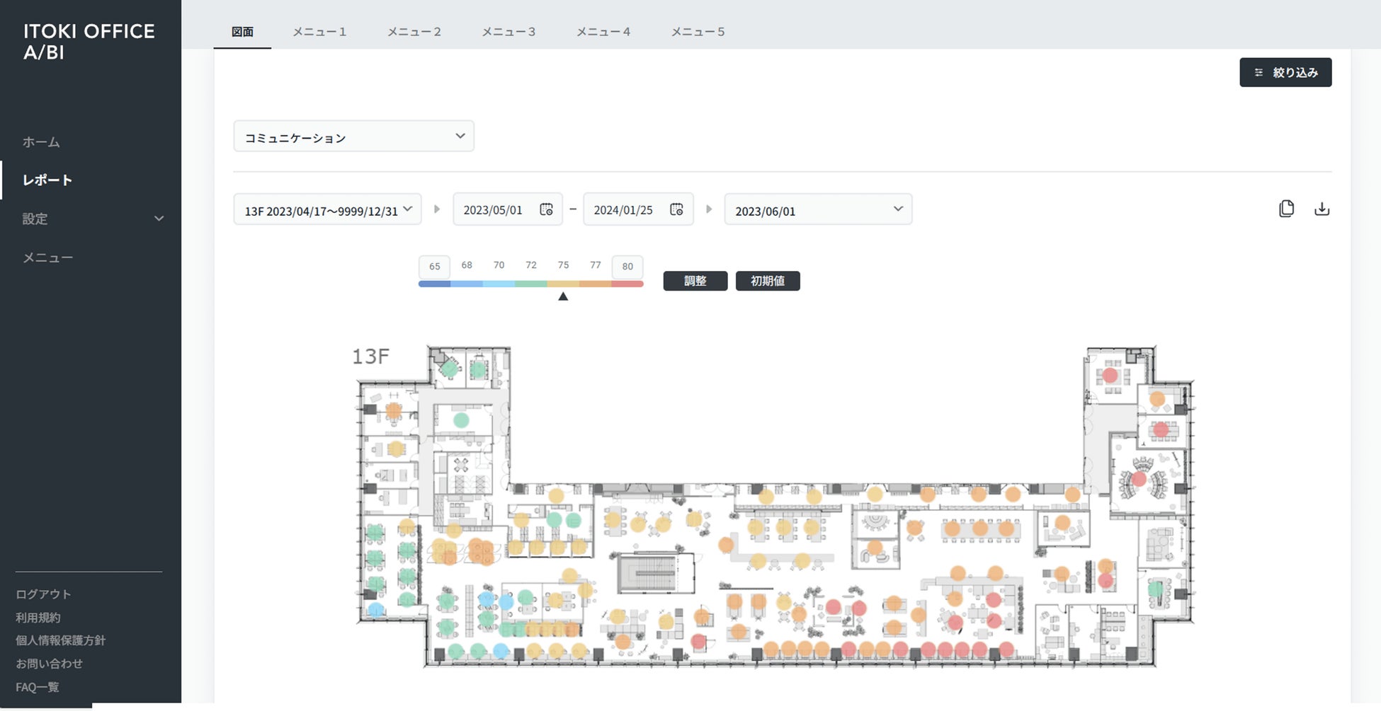 例えば、オフィスリニューアル前に、従業員のエンゲージメントを高めたい場合は、現行オフィスでエンゲージメントが高い層の「スペース利用傾向分析」を行います。その指標に良い影響を与えているスペースを特定し、多人数で利用可能な適切な面積やアクセスしやすい位置へのレイアウトを提案します。また、オフィスリニューアル後に、一人用の集中ブースやWEB会議ブースを特定の層が独占する課題がある場合は、「特定ユーザー占有率分析」を行い、運用上望ましくない状態のスペースを詳細に確認し、スペース予約や利用時間に関する運用ルールの見直しをご提案することが可能です。