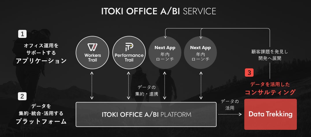 当社のオフィスデータを収集・統合・活用するための「ITOKI OFFICE A/BI PLATFORM」を基盤に展開する各種サービスの総称を、「ITOKI OFFICE A/BI SERVICE」とし、今後は「Data Trekking」を含む複数のサービスやアプリケーションの展開を予定しています。当社はこれからもオフィス構築・運用の品質を高め、お客様の人的資本経営の推進をサポートします。