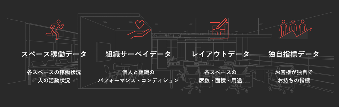 オフィスデータについては、データを収集・統合・活用するための、当社独自のプラットフォーム「ITOKI OFFICE A/BI PLATFORM(イトーキ・オフィス・エービーアイ・プラットフォーム)」を基盤に、スペースの稼働データ、組織サーベイデータ、レイアウトデータ、そのほかお客様が独自でお持ちの指標データなどを集積し、分析します。