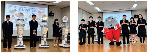 2025年3月8日(土)、和歌山県立串本古座高等学校にて、完成お披露目会が開催されました。本イベントは、生徒たちが司会進行を務め、温かい雰囲気のなかで進行しました。当日は、参加企業と串本町が用意したサプライズとして、串本町のキャラクター「まぐトルくん」が登場。思いがけないゲストの登場に、会場は大いに盛り上がりました。さらに、「まぐトルくん」から生徒たちへ記念品が贈られ、生徒たちは笑顔で受け取っていました。また、お披露目会に参加した生徒や来場者たちは、記念として「がちゃ」を思い思いに楽しみました。自分たちの努力が形になったことを実感し、「がちゃ」を回すたびに歓声が上がるなど、和やかなひとときとなりました。