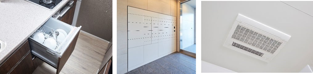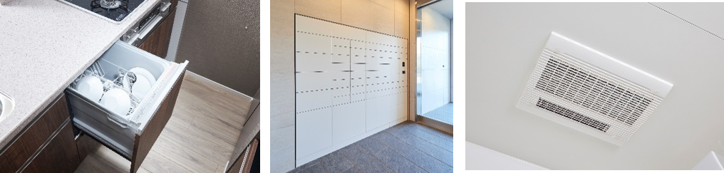 ※左から、ビルトイン食器洗い乾燥機、宅配ロッカー、浴室換気暖房乾燥機(電気式)