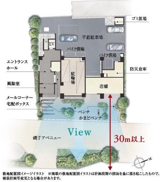 敷地は、「磯子アベニュー」View、全邸南東向きの心地良い配棟計画を実現。敷地を囲うように植樹された美しい植栽計画など、暮らしやすさや心地良さを追求したランドプランです。さらに、地震など万一の災害時に使用する防災備品をストックする防災備蓄倉庫を設置しており、災害時の炊き出し等で利用できる「かまどベンチ」も設置しています。