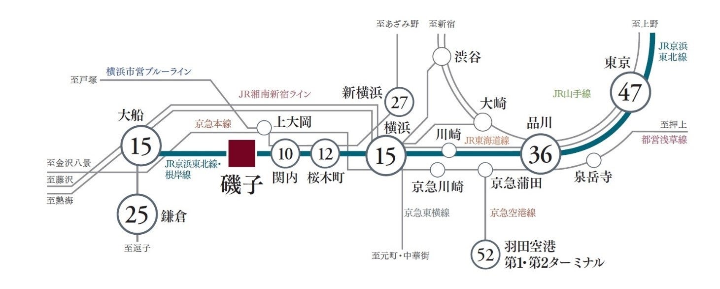 ※JR京浜東北線・根岸線「磯子」駅より:「横浜」駅/JR京浜東北線・根岸線利⽤、「品川」駅/JR京浜東北線・根岸線利⽤、「横浜」駅でJR東海道本線(上野東京ライン)に乗り換え。