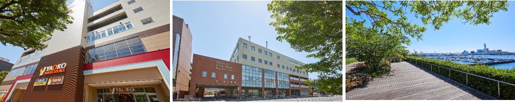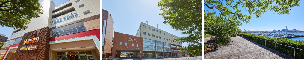※左から、ヤオコー横浜磯子店、磯子中央病院、磯子・海の見える公園