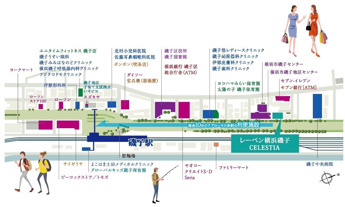 徒歩圏には、スーパーや公共・医療施設などの多彩な生活利便施設はもちろん、プールのある「芦名橋公園」や「磯子・海の見える公園」など憩いの場もあり、暮らしやすさを大きく高めています。