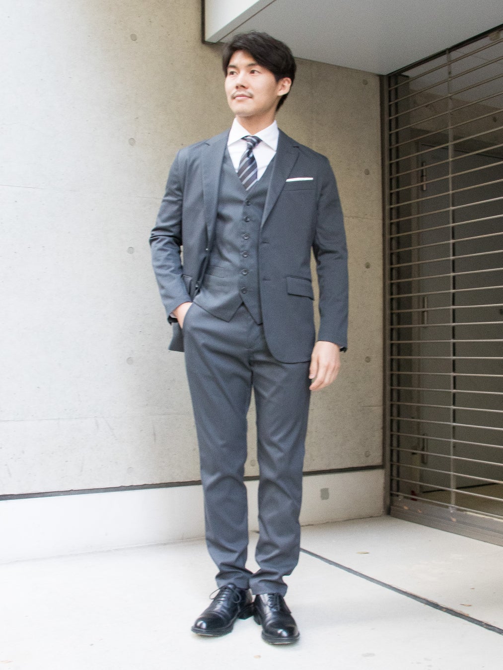 特徴: 生地はストレッチ・撥水・速乾・防シワなどの高機能性を供える自社オリジナル素材「ultimex」と、特殊な染め方をした「カチオン糸」の2種類を使用。着丈は、シャツが前から見えない長さに設計。「大人のBizモデル」のセットアップとスリーピースで着用できます。自宅の洗濯機で丸洗い可能。