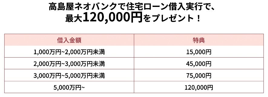髙島屋ネオバンクで住宅ローンの借入を行った場合、最大12万円をキャッシュバックいたします。本プログラムは、2025年3月21日(金)以降の住宅ローン実行分より対象となります。