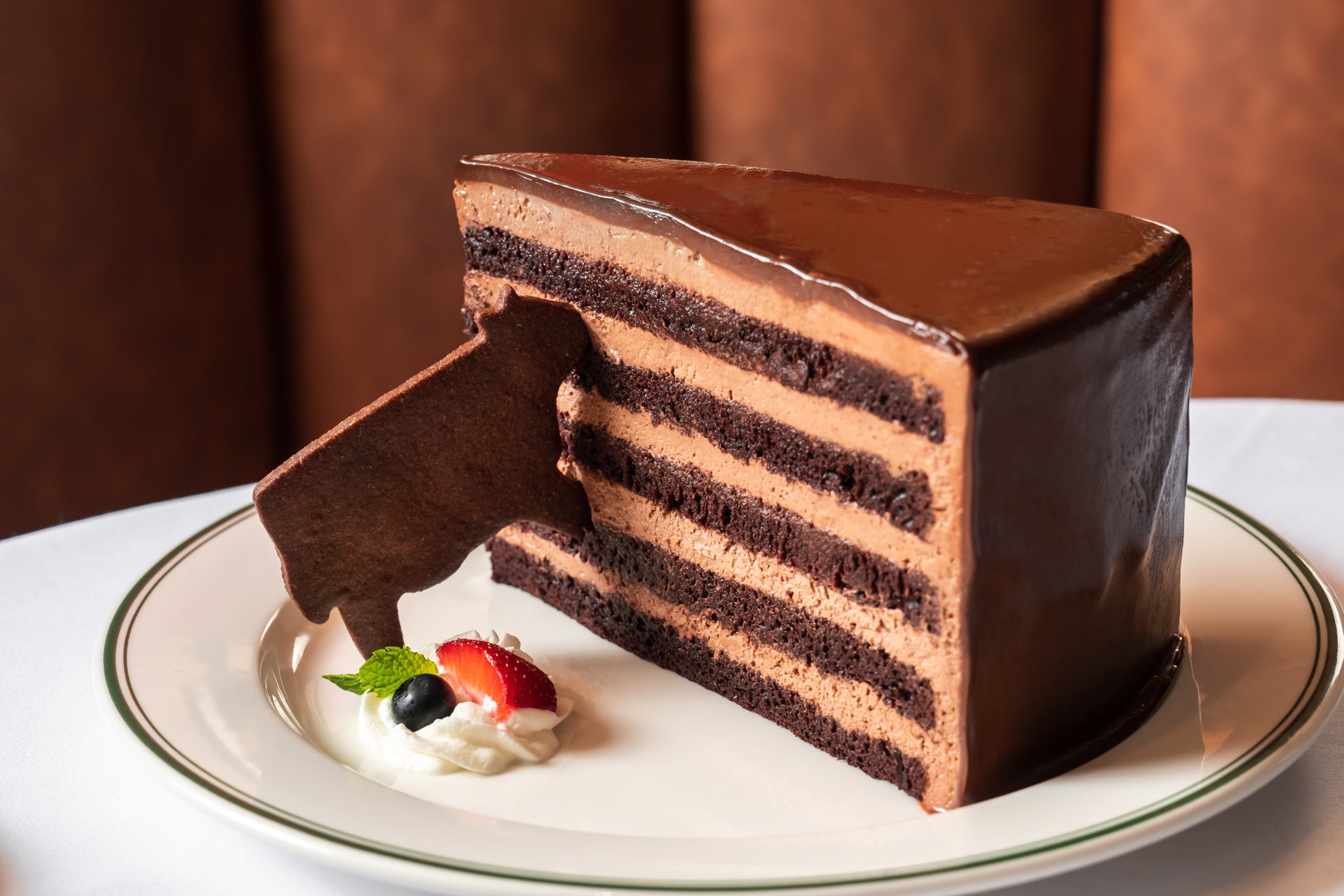 デザートの目玉は、Smith & Wollenskyで“名物中の名物”として愛される「ギガンティックチョコレートケーキ」。直径36cm、高さ15cmという圧倒的なスケールで何層にも重なる濃厚なケーキは、リッチでクラシックなアメリカンスタイルを象徴する一皿です。甘美で重厚な味わいと迫力に満ちた佇まいは、まさに美食の夜を完結させる「華麗なる終幕」。テーブルに運ばれた瞬間に場を華やがせる、Smith & Wollenskyならではの至高のデザートです。