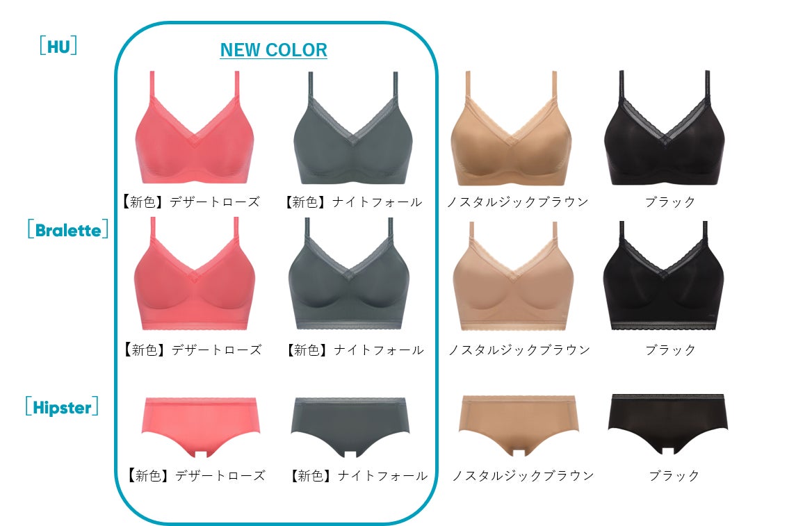 独自技術のインジェクションウェーブとジオメトリックサポートで、究極ともいえる快適なフィット感を実現したシリーズ。着脱がフック&アイ仕様の[HU]のほか、アンダーが長めでファッションライクな見た目のかぶりタイプ[Bralette]もご用意。カップアンダーの立体的なシリコンサポート構造がバストを支え、ノンワイヤーでも美しいシルエットをメイクします。今シーズンは、秋のニュアンスをまとったデザートローズとナイトフォールが加わりました。