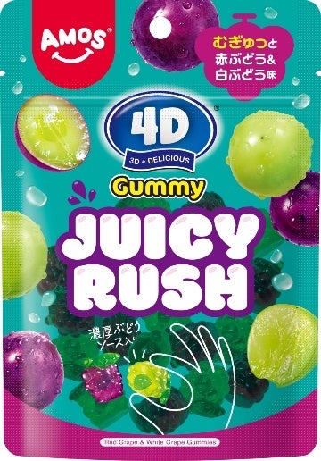 Amos社が展開する濃厚ジュレが入った「4D FRUIT GUMMY JUICY BURST(フルーツグミ ジューシーバースト)」シリーズは、国際的なアワードで受賞歴もある世界的人気商品です。このたび発売する「4Dグミジューシーラッシュグレープ」は、同シリーズを活用したカンロオリジナル商品で、中には濃厚なぶどうソースが入った赤ぶどうと白ぶどうの2種のフレーバーのアソートです。グミ粒はAmos社の割型製法による精巧で立体的なかわいいぶどう型。立体だからこそ生み出される独特の“むぎゅっと食感”と濃厚なぶどうソースをお楽しみいただけます。