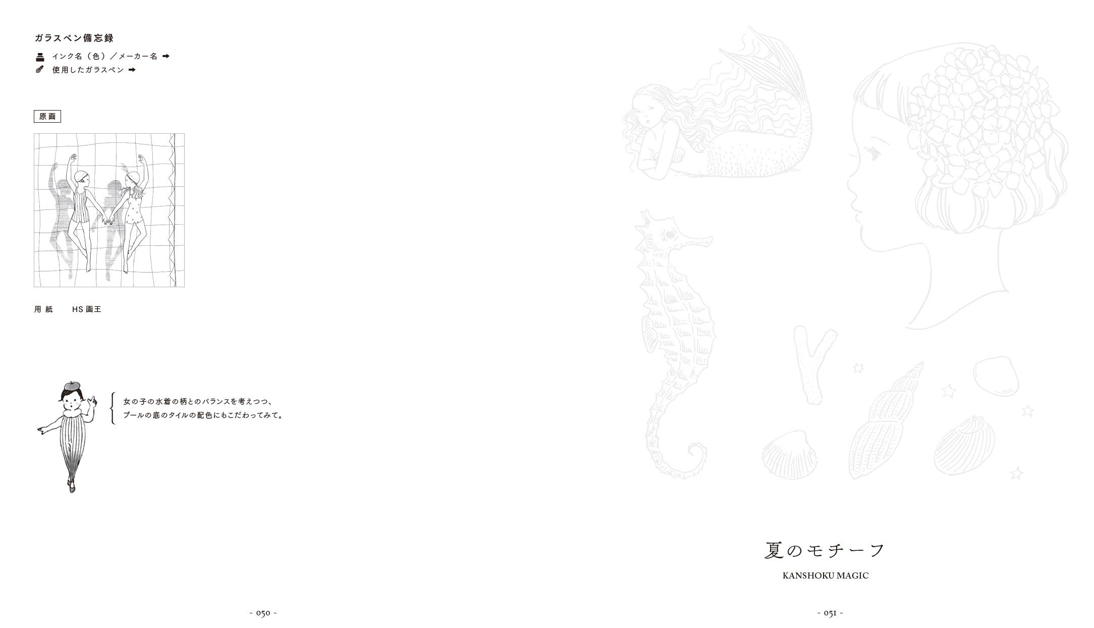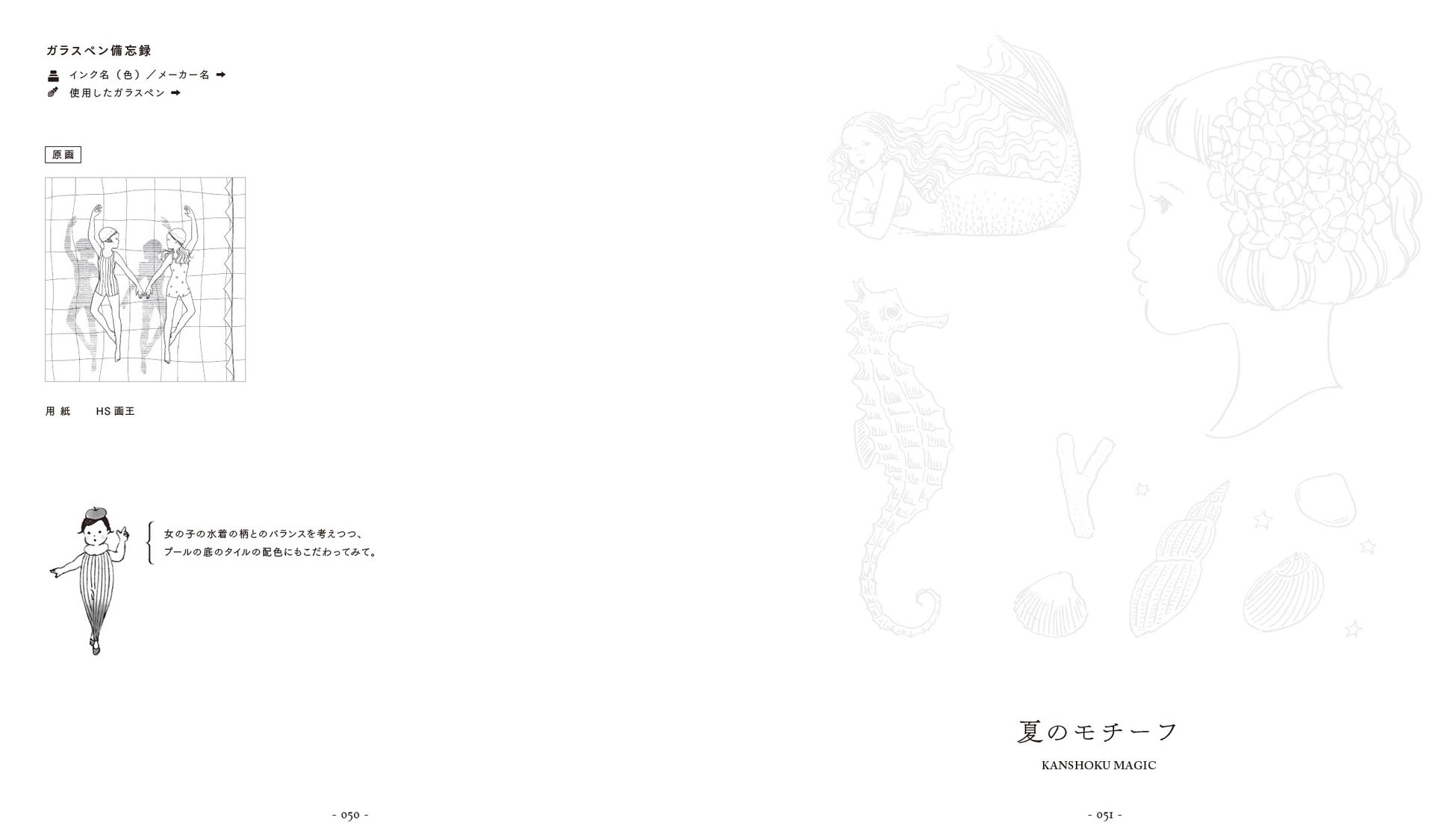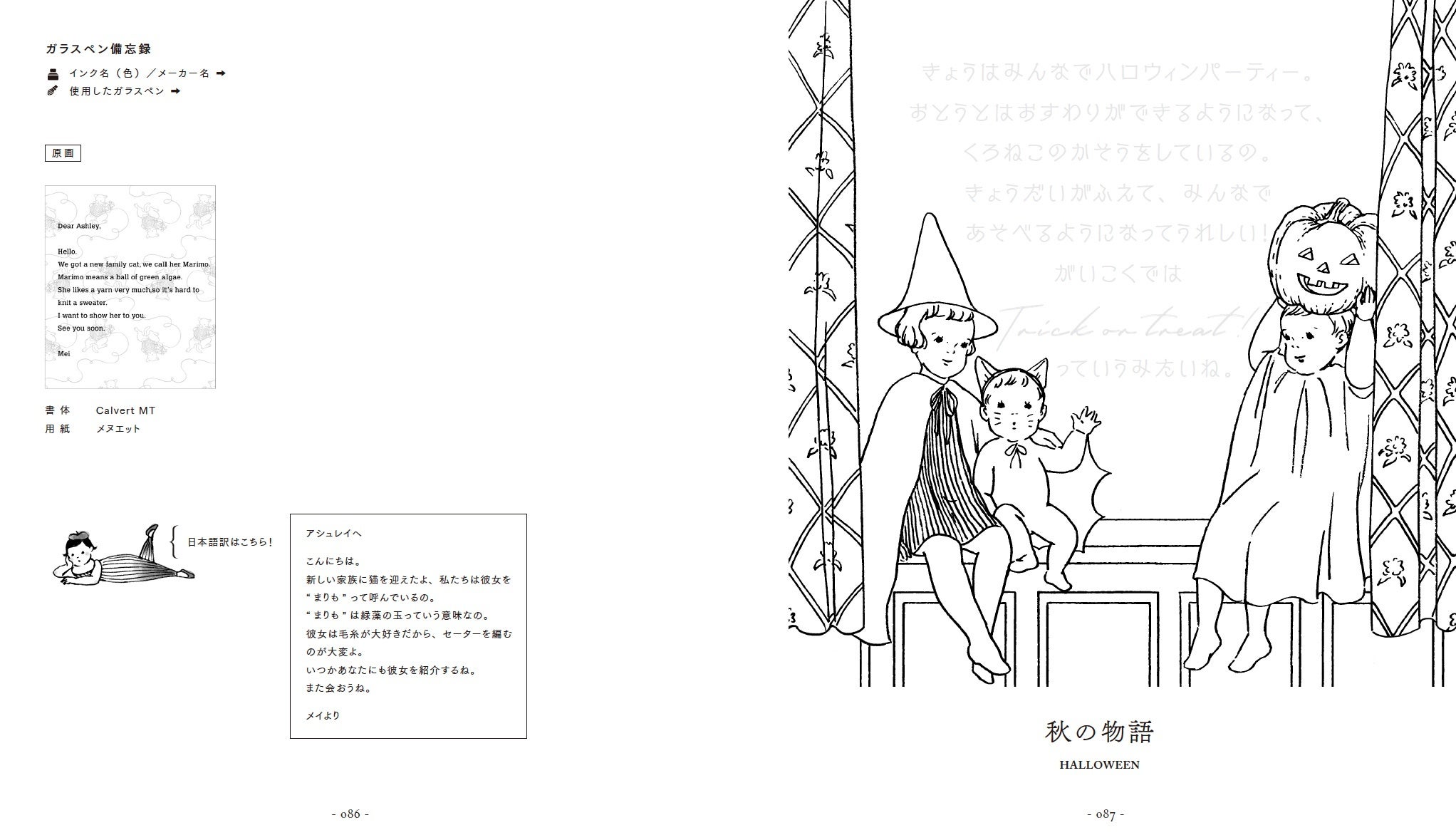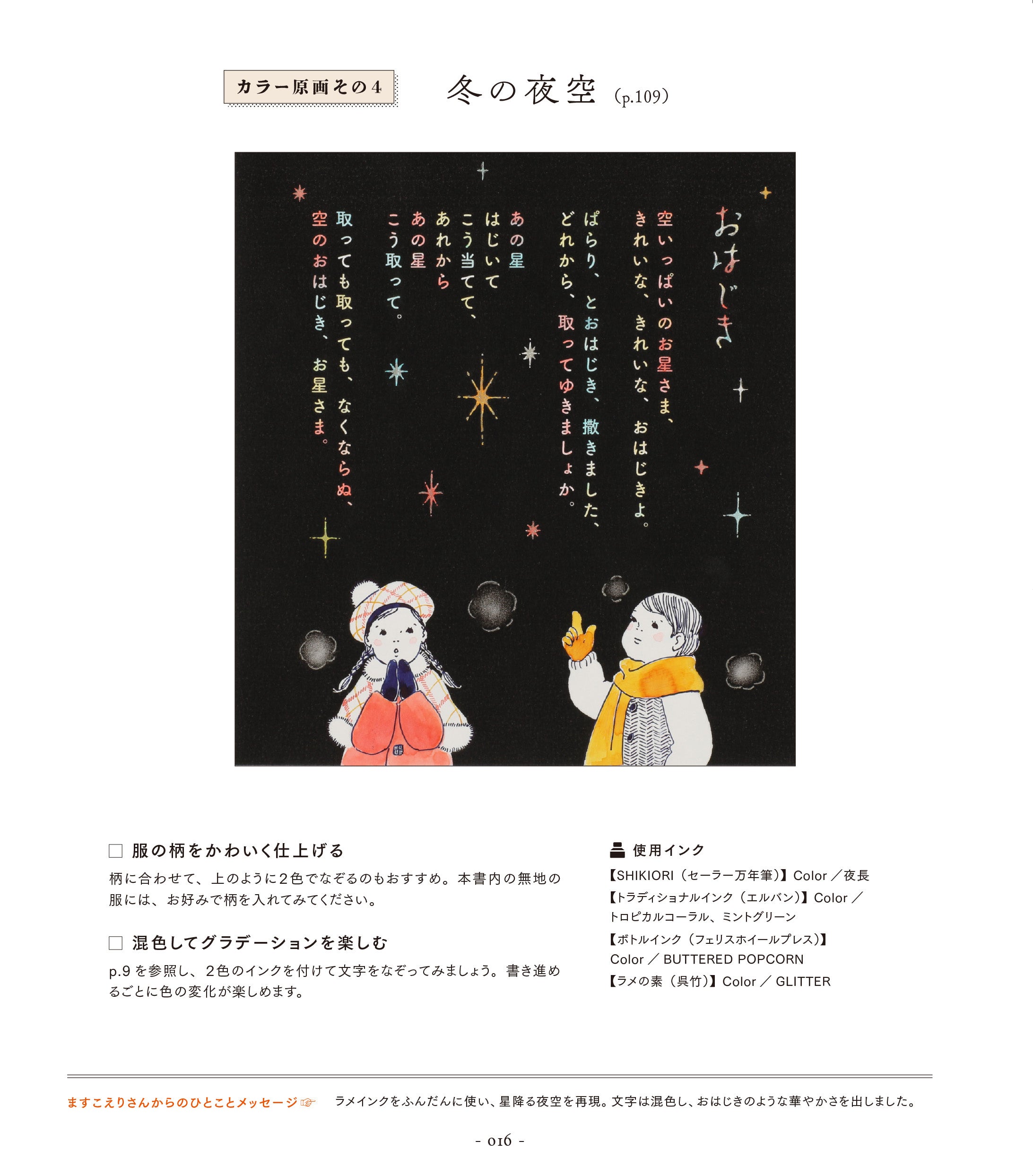 ガラスペンに限らず、万年筆やラメペン、ミルキーペンなどでもお楽しみいただけます。水筆を使った色の濃淡を楽しむアイデアも提案。ますこえりさん直筆のカラー原画の紹介ページでは、ますこえりさんからのひとことメッセージも。きれいに仕上げるコツは必読です!