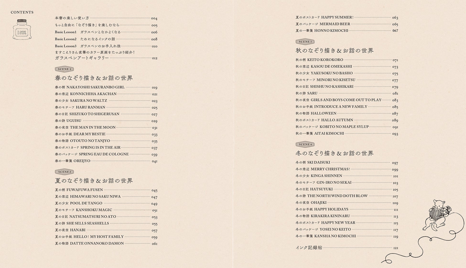 ますこえりさんならではの、愛らしくもクスッと笑える女の子や子どもたちとともに季節の移ろいを感じられるイラストばかりです。カバー表紙を飾る乙女心くすぐるかわいい香水のパッケージや、ラメインクも活用できる夜空のデザイン、ついのぞき見したくなる日記など、イラストに合わせてインク×色数を選ぶのもまた一興。自分でイラストを描くことが苦手な方も、丁寧になぞれば、ますこさんのかわいいイラストが仕上がるはず!