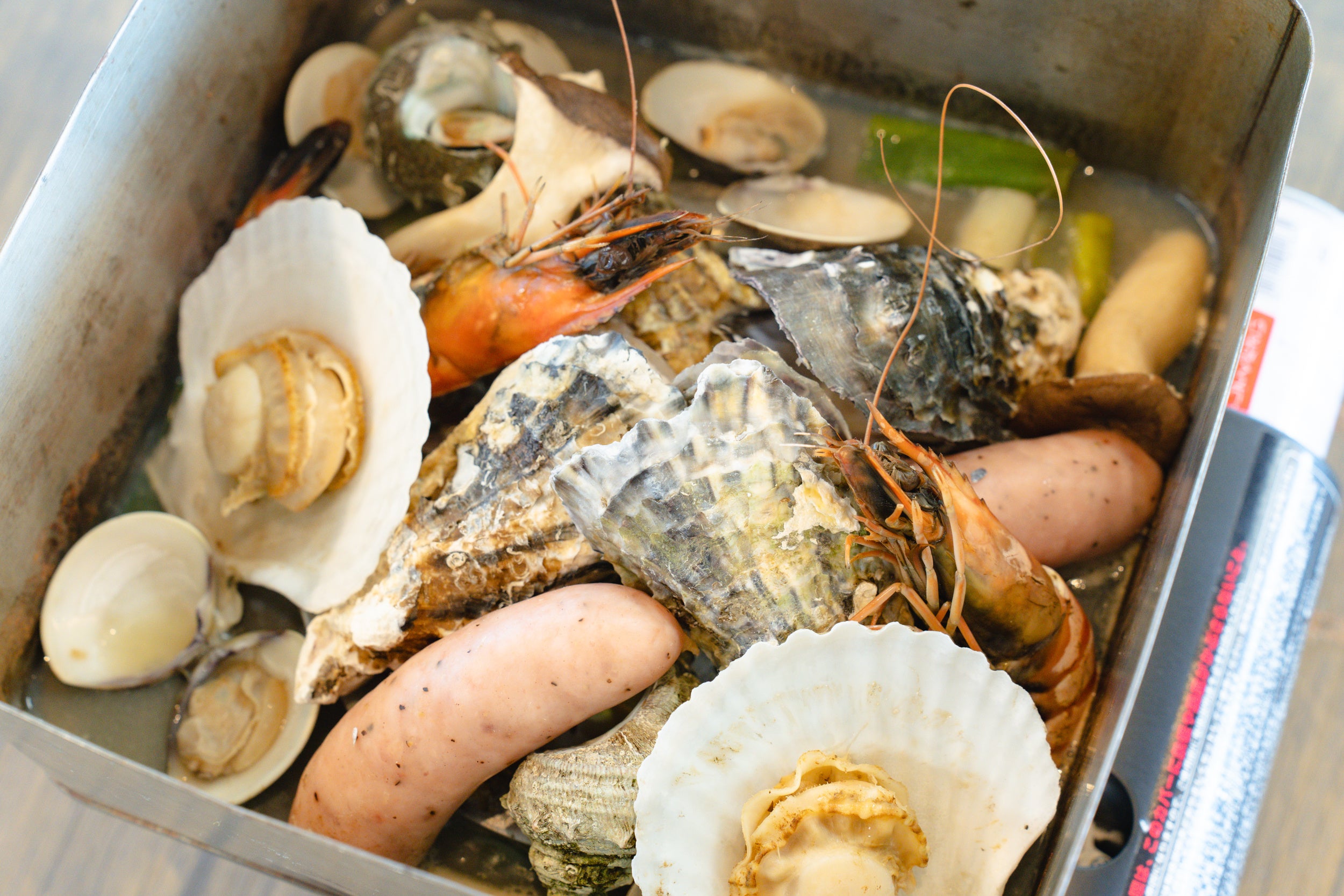 またガンガン焼きの種類は牡蠣だけでなく、野菜やエビ、ソーセージなどの海鮮の入った『乙姫』『浦島』などの海鮮ガンガン焼きも用意。