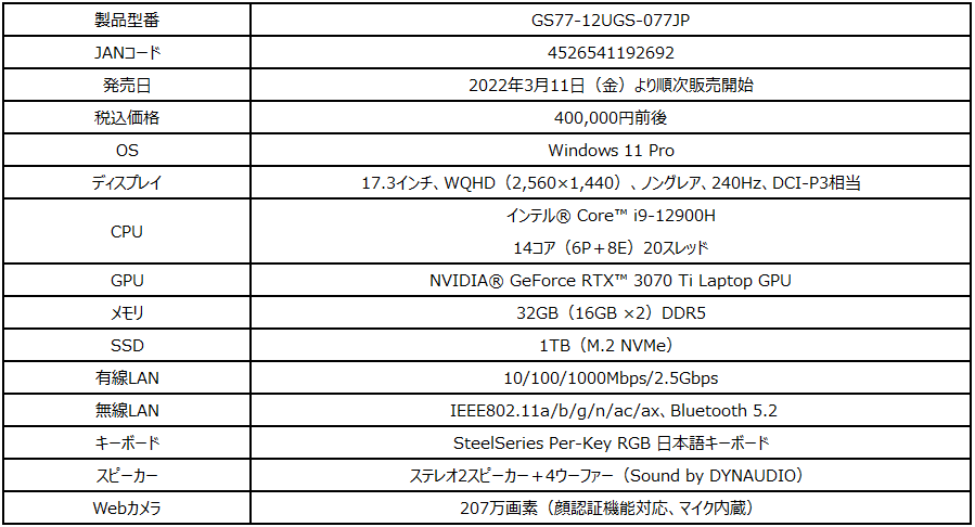 この度、エムエスアイコンピュータージャパン株式会社は、ハイブリッドコアアーキテクチャを採用し、マルチタスク・ゲーミング・クリエイティブなどあらゆる用途において処理性能が大幅に向上した「第12世代インテル® Core™ i9 プロセッサー」とハイエンドグラフィックス機能の最新モデル「GeForce RTX™ 3070 Ti Laptop GPU」を17.3インチの薄型筐体へ詰め込んだハイエンドゲーミングノートPC「Stealth GS77 12U」を2022年3月11日(金)より発売いたします。