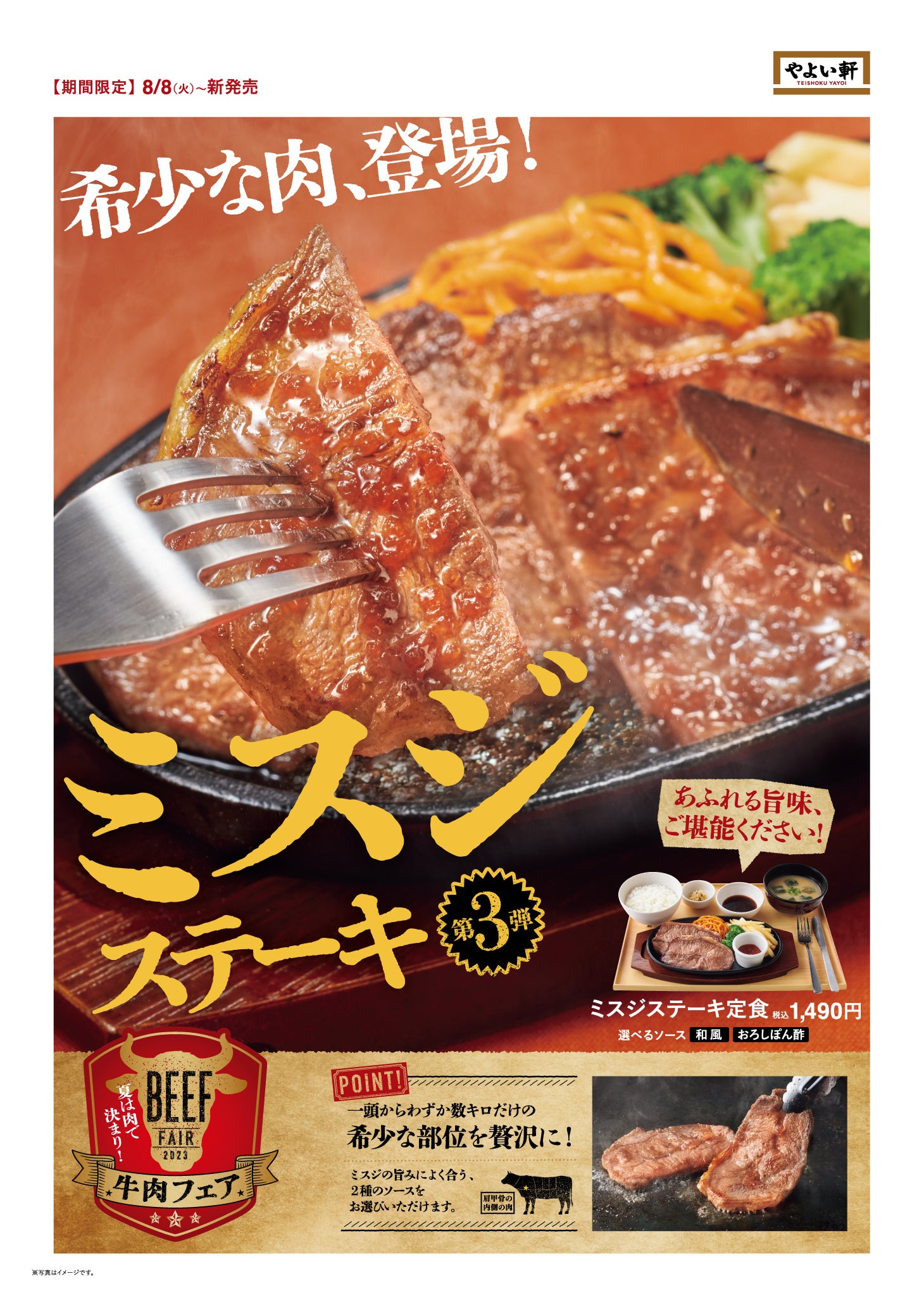 「やよい軒」夏だ!肉だ!牛肉フェアだ!牛肉フェア第三弾は希少部位”ミスジ”を贅沢に使ったステーキが初登場!ミスジステーキ定食【和風ソース/おろしぽん酢】8月8日(火)より新発売