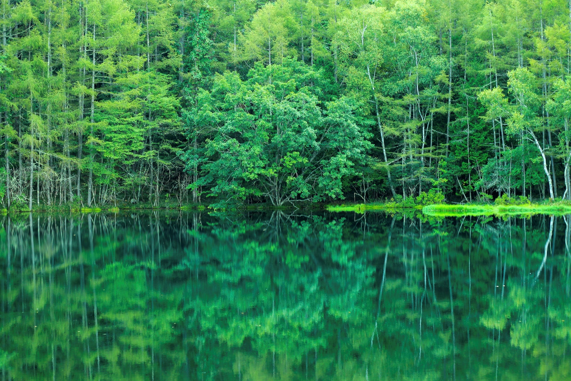 水面に映った緑の木々がまるで絵に描いたような美しさです。写真全体がグリーンで敷き詰められており、とても印象的な1シーンだと思います。