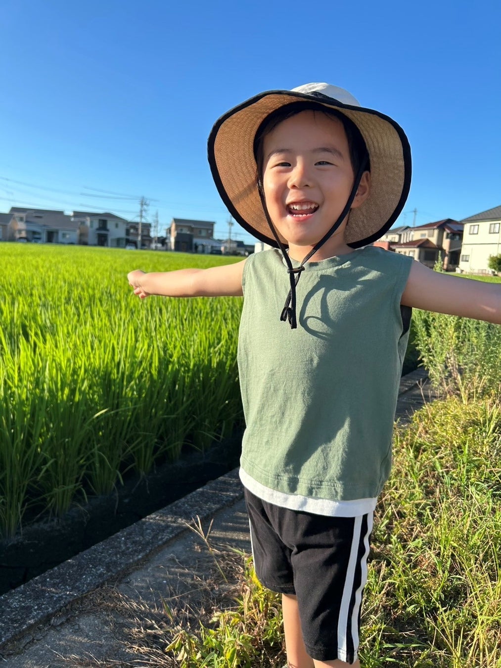 日課のお散歩中、田んぼの緑が綺麗だったので思わず撮った一枚です。たまたま息子の服も緑色、笑顔も弾けて良い写真だと思って選びました。
