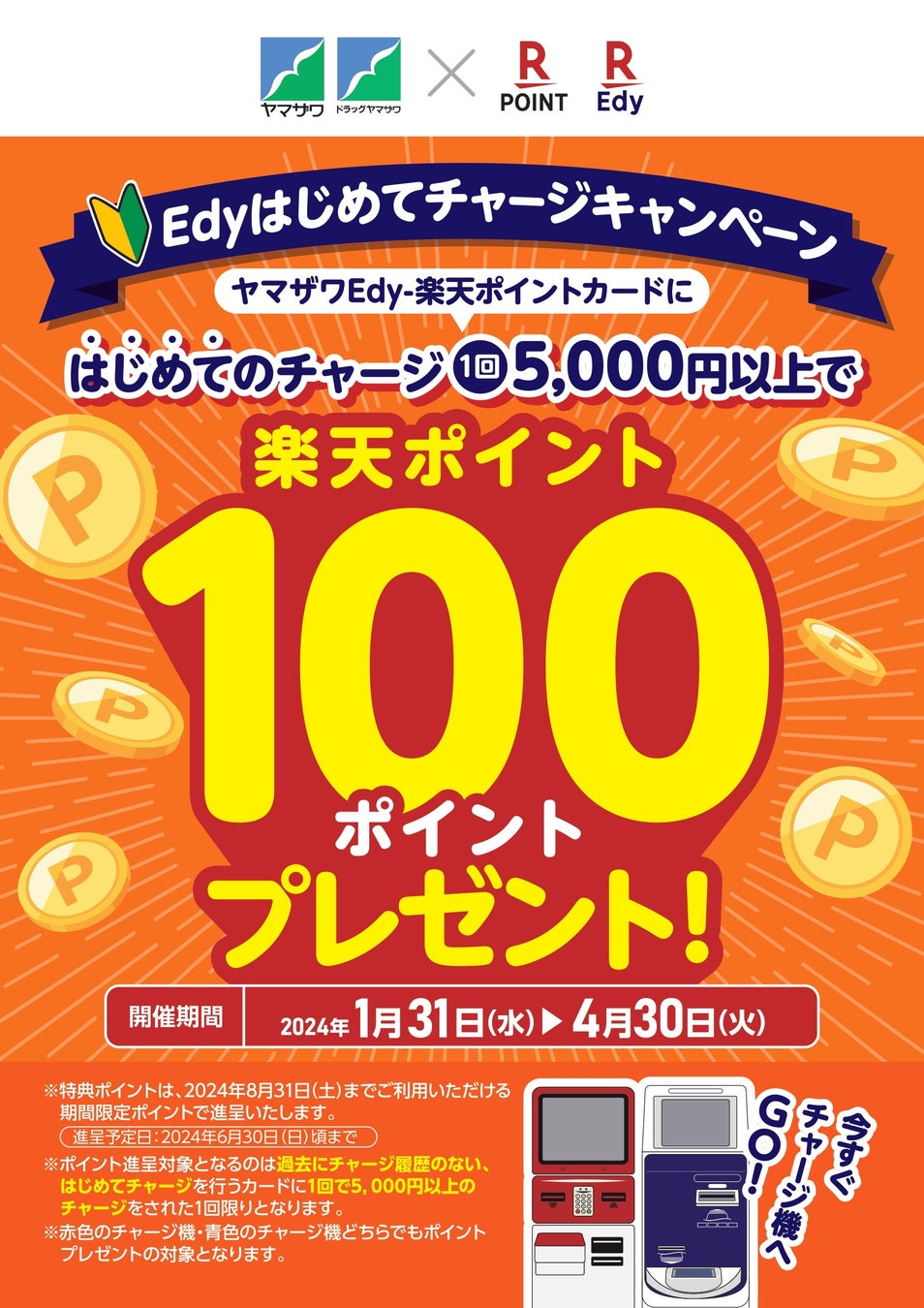 さらに、2024年1月31日(水)~4月30日(火)まで、「楽天Edyはじめてチャージキャンペーン」を実施します。対象店舗に設置されたチャージ機で「ヤマザワ Edy-楽天ポイントカード」にはじめて5,000円以上チャージされた方にもれなく「楽天ポイント」を100ポイント進呈します。