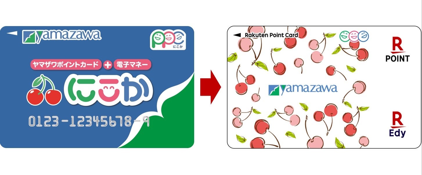 ヤマザワは、これまで導入していた自社ポイントカード「にこかカード」のサービスを終了し、「楽天ポイントカード」と「楽天Edy」機能を搭載したオリジナルデザインの「ヤマザワ Edy-楽天ポイントカード」へ切り替えを行います。