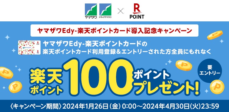 導入を記念して、2024年1月26日(金)より「ヤマザワ」「ドラッグヤマザワ」の全店にて「ヤマザワ Edy-楽天ポイントカード」の配布を開始します。併せて、2024年1月26日(金)~4月30日(火)まで、「ヤマザワでサービス開始!ヤマザワ Edy-楽天ポイントカードを利用登録した方へ100ポイントプレゼント!」キャンペーンを実施します。本キャンペーンでは、キャンペーン期間中にエントリーのうえ、「ヤマザワ Edy-楽天ポイントカード」の利用登録をした方にもれなく「楽天ポイント」を100ポイント進呈します。