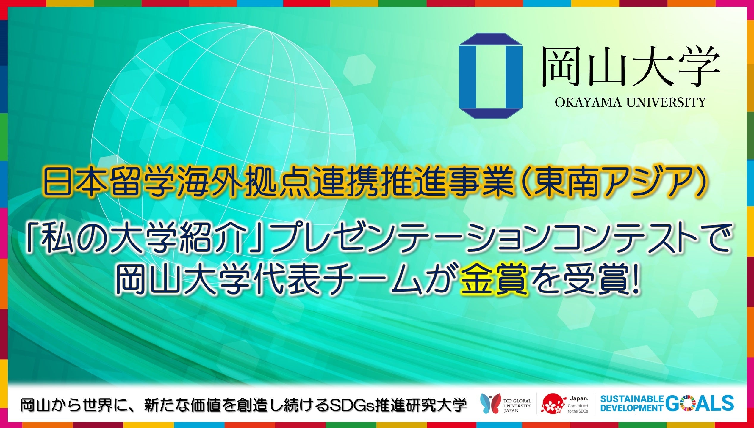 国立大学法人岡山大学(本部:岡山市北区、学長:槇野博史)は、2021年12月14日、文部科学省委託事業「日本留学海外拠点連携推進事業(東南アジア)」の活動の一環として「私の大学紹介」プレゼンテーションコンテストをオンラインで英語により開催し、本学の代表チームが見事金賞を受賞しました。