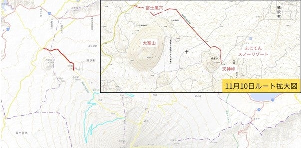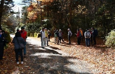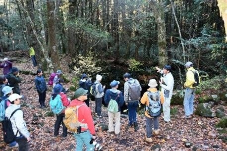 山梨県は令和7年11月10日(月)、富士山精進口登山道を舞台に、メディアや地元関係者に向けたファムトリップを開催しました。本企画は、古くから信仰の対象として人々に親しまれてきた富士山の文化的意義に触れ、伝統を守り続けてきた地域の歴史を感じてもらうため、古くから富士山麓で使われていた登山道(以下、古の登山道)の復興を目指して実施しました。今回のファムトリップには約30名が参加しました。参加者は、古の登山道の一つである「精進口登山道」のうち、天神峠から、大室山や富士風穴を経て山梨県道71号富士宮鳴沢線(以下、県道71号線)までの区間を歩きながら、豊かな自然植生や林業遺構などを見て回り、富士山の魅力を堪能しました。