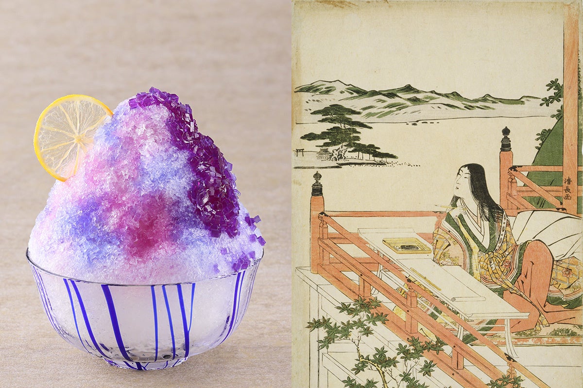 <紫式部>は一条天皇の中宮・彰子の女房として宮仕えをし、性格は奥ゆかしく控えめで人づきあいが苦手なタイプ。<清少納言>は一条天皇の皇后・定子の女房として宮仕えをし、性格は陽気で自信にあふれ社交的なイケイケタイプ。作風もそれぞれ個性が有り、とかく比較される事が多いと言われています。今回は、強さを内に秘める<紫式部>、華やかできらびやかな<清少納言>、それぞれの性格や作品をイメージした夏限定のかき氷を2種ご用意、『暑い夏のかき氷対決』をぜひお楽しみください。