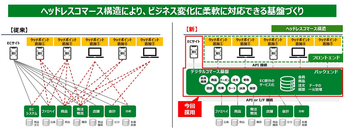 一方で、店舗、EC、ファミペイアプリなどお客さまとの接点が多様化すると同時に、既存のバックエンドシステムの連携と最適化が課題となっており、デジタルコマース基盤の刷新が急務でした。そこで、「ファミマオンライン」において、フロントエンド(お客さま接点)とバックエンド(業務システム)を分離し、API(注4)連携可能な「Unified Commerce」を導入しました。