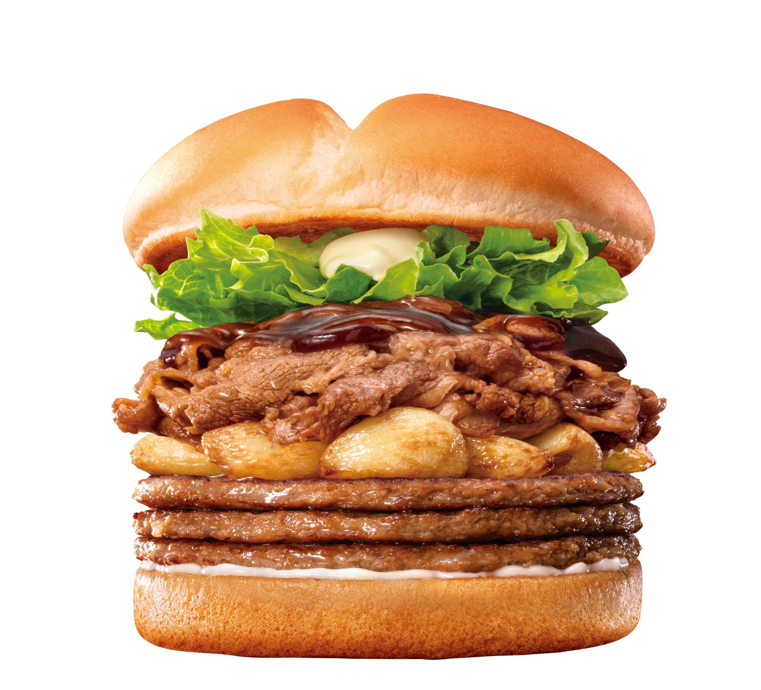 商品概要:「ニンニク 牛カルビバーガー」のハンバーグパティを3枚重ね、牛カルビ肉とニンニクを約2倍に増量しました。旨みたっぷりの牛肉とホクホク食感のニンニクと一緒に、レタス、マヨネーズ、からしマヨをふっくらなめらかな食感のバンズで挟んでいます。