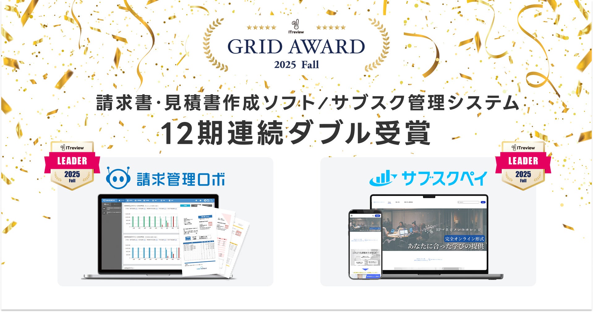 請求管理ロボ、サブスクペイが「ITreview Grid Award 2025 Fall」の最高位、『Leader』を12期連続ダブル受賞